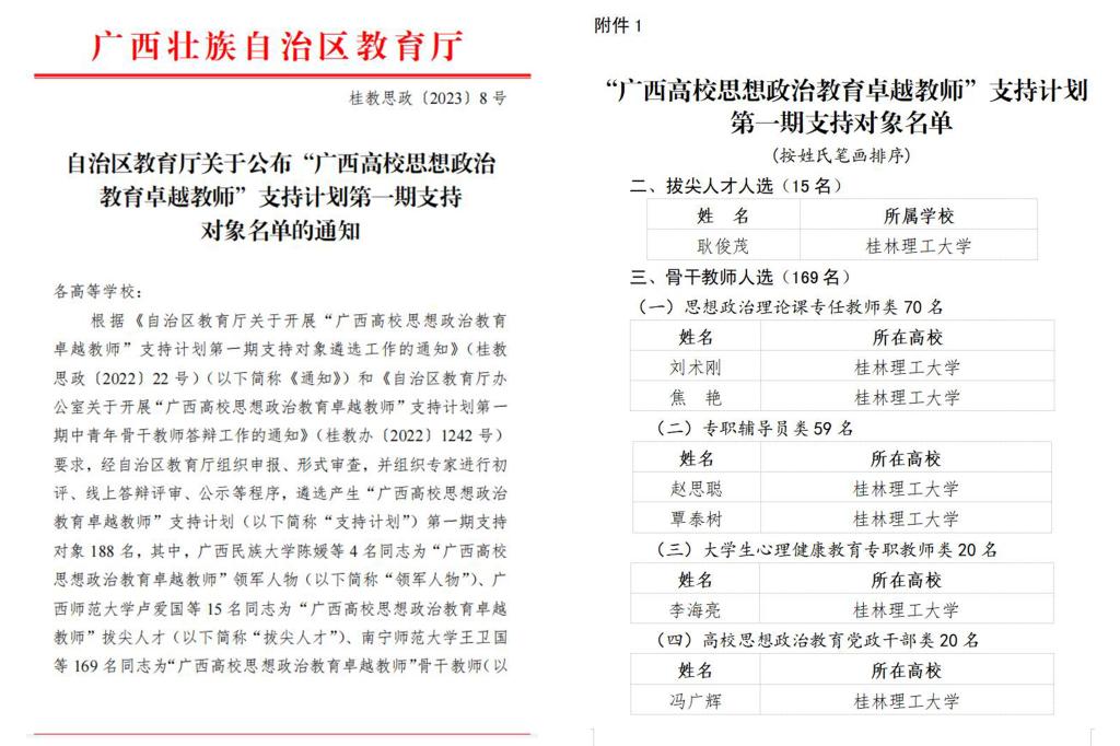 据悉,“广西高校思想政治教育卓越教师”支持计划是根据自治区党委的统一部署,为加强广西高校思想政治教育人才队伍建设,面向全职在岗的全区高校思想政治教育工作队伍进行广泛遴选,具体包括思想政治理论课专任老师、专职辅导员、大学生心理健康教育专任教师和其他思想政治工作人员。此次我校共有7名教师入选“广西高校思想政治教育卓越教师”支持计划,必将为学校今后思想政治教育工作队伍整体水平提升与思想政治教育质量提高奠定坚实的人才基础。