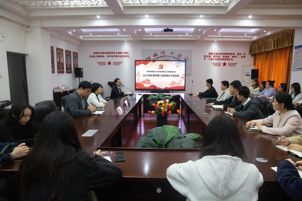 11月12日,学院在雁山校区07415教室举行2025年秋季学期入党积极分子开班仪式。学院党委书记梁英、党委副书记兼纪委书记马彬彬出席,31名积极分子参与,仪式由学院李碧仙老师主持。