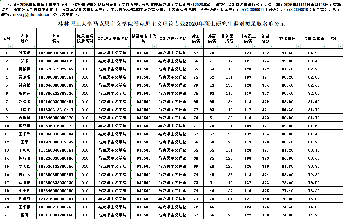 根据教育部及我校相关文件规定,现将马克思主义学院复试拟录取名单(调剂)进行公示。公示期7日,如考生对复试录取名单有异议,请与我院办公室联系,联系电话0773-3698618。