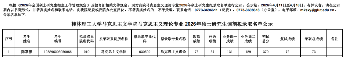 根据教育部及我校相关文件规定,现将马克思主义学院复试拟录取名单进行公示。公示期7日,如考生对复试录取名单有异议,请与我院办公室联系,联系电话0773-3698618。